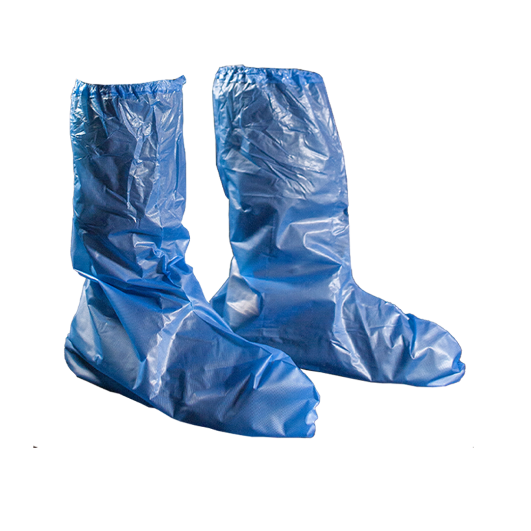 Protector de un solo uso de Polietileno Clorado (CPE), diseñado para alta cobertura 50cm e impermeabilidad. Ofrece una barrera efectiva para reducir la contaminación y cuenta con un acabado externo micro texturizado que lo hace antideslizante. Cierre superior con elástico perimetral para un ajuste seguro.